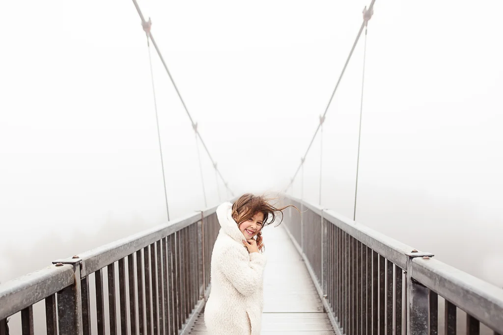 When composing your images, try to make your lines point TO your subject. By changing your perspective and shooting viewpoint, you can add in more depth and dimension to the image. In the photo above, I photographed my kiddos on a swinging bridge, but made sure I had enough of either side of the bridge to add in a little depth to the image. The sides of the bridge and the wooden slats draw your eye right to them. In the image below, I shot looking down on my son and used the curtains and lines of the windows to lead down to him.